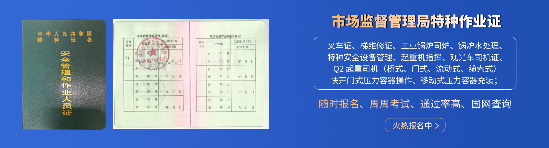 叉車證,電梯維修證,起重司機(jī)-橋式-門式-流動(dòng)式,起重指揮,壓力容器操作,鍋爐司爐,水處理,特種設(shè)備管理,觀光車;